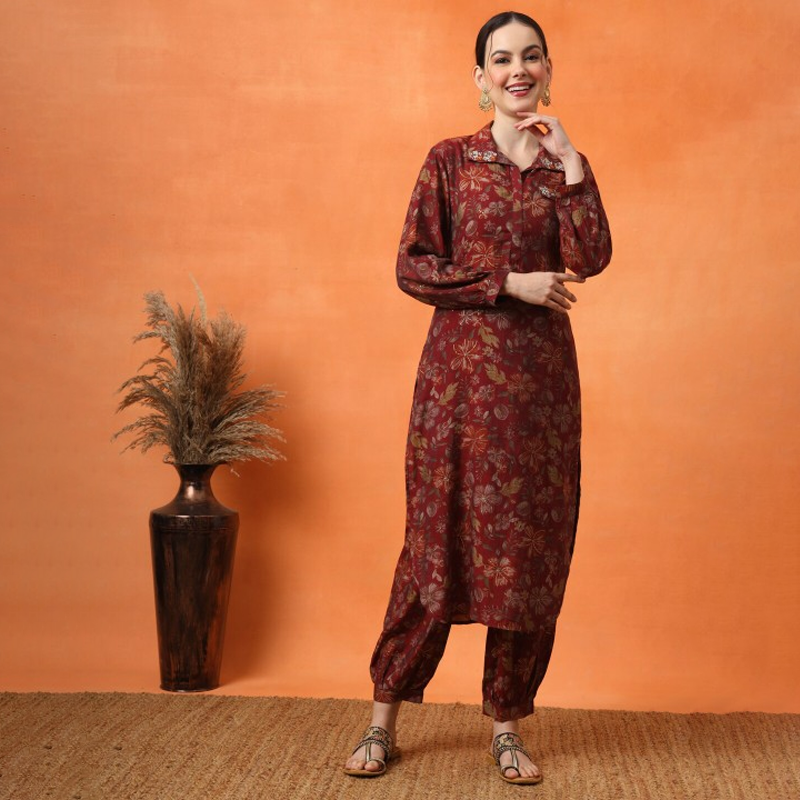 Floral Embroidered Beads & Stones Pure Silk Kurta With Trousers & Dupatta