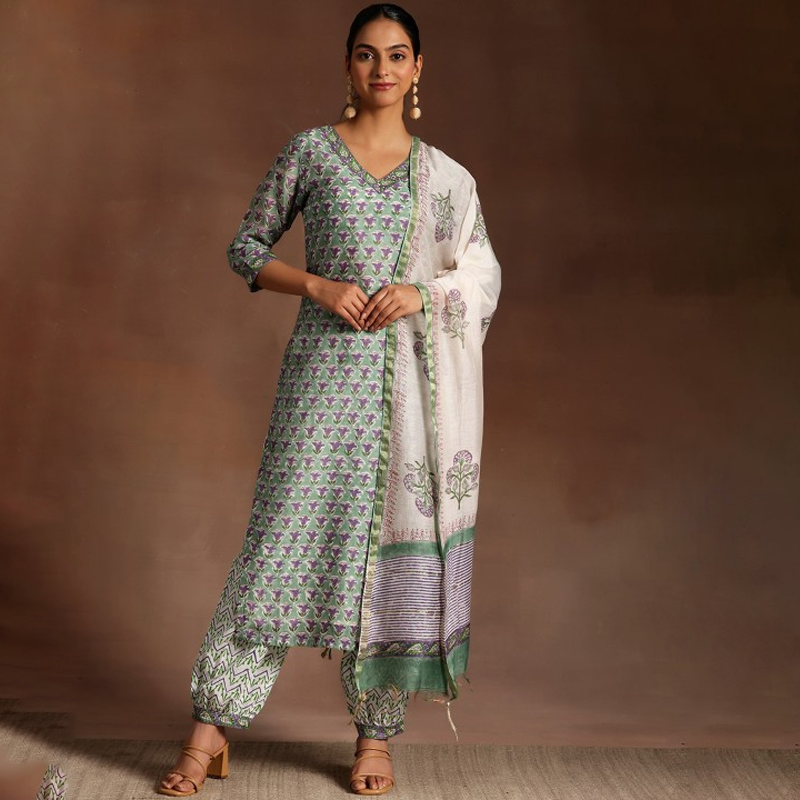 Ethnic Motifs Printed Pure Cotton Straight Kurta With Salwar & Dupatta