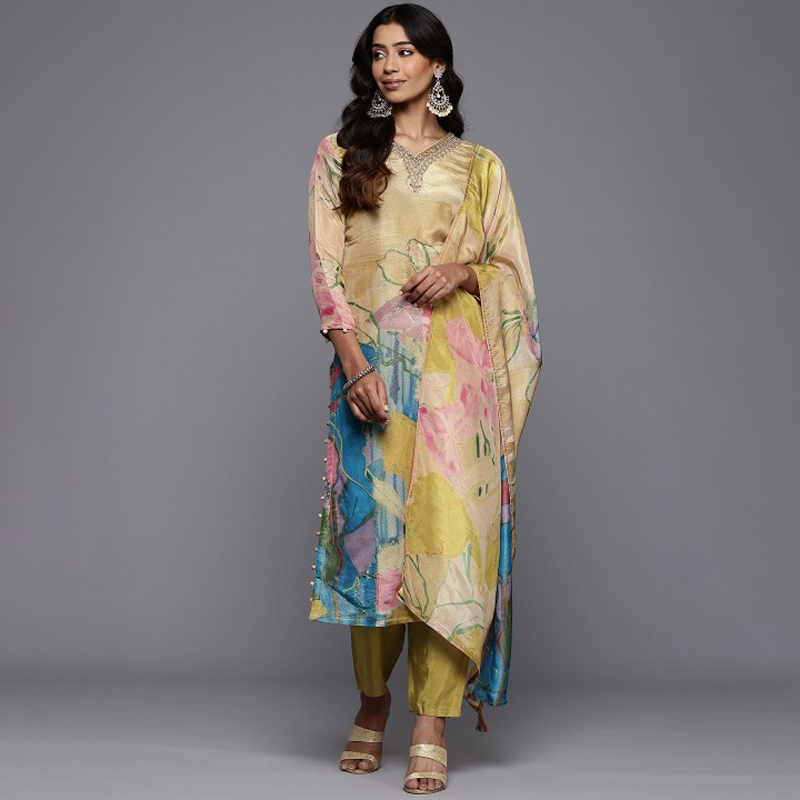 Floral Embroidered Beads & Stones Pure Silk Kurta With Trousers & Dupatta