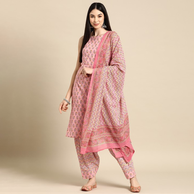 Women Pink & Gold-Toned Ethnic Printed Pure Cotton Kurta with Salwar & With Dupatta