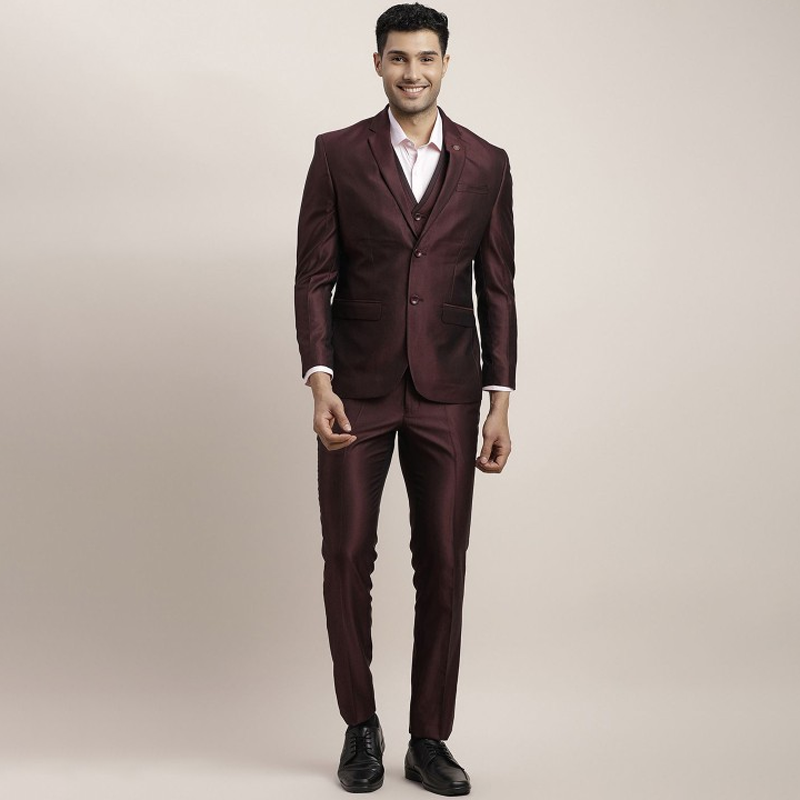 Men Burgundy Solid Single-Breasted Slim-Fit Formal Suit