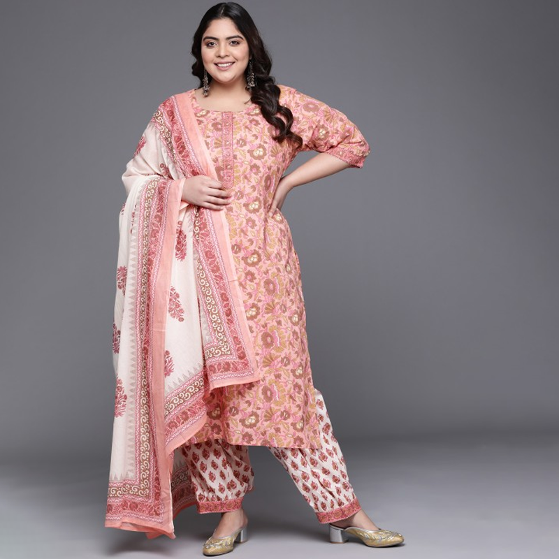 Plus Size Women Floral Cotton Kurta with Salwar & With Dupatta